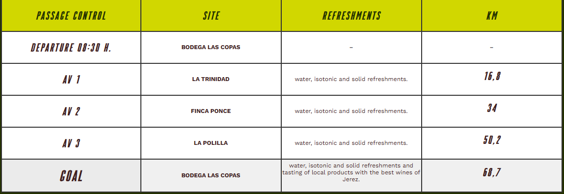 water, isotonic and solid refreshments and tasting of local products with the best wines of Jerez.