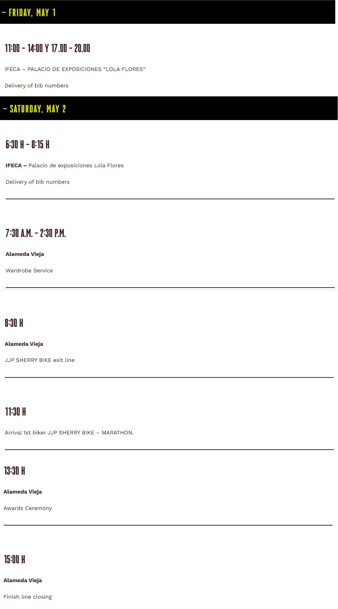 The Sherry Bike Marathon will cover a distance of 67.6 km, starting on Saturday, 2 May at 8:30 a.m. from the Alameda Vieja. The first kilometers are an urban tour through the main streets of the city before entering the sea of vineyards of the Marco del Jerez.