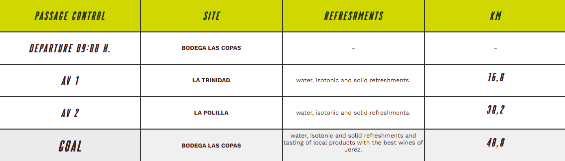 water, isotonic and solid refreshments and tasting of local products with the best wines of Jerez.